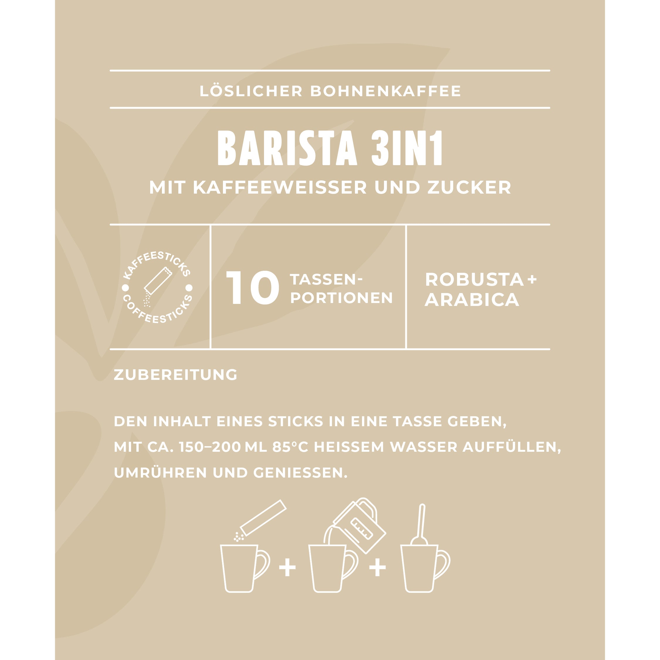 Unsere Selektion Barista Crema 3in1 – die unkomplizierte Lösung für genussvolle Barista-Momente jederzeit. Löslicher Bohnenkaffee, bereits harmonisch veredelt mit Kaffeeweißer und Zucker, bildet die Basis für diese praktische All-in-One-Komposition. Kräftig und intensiv im Geschmack. Würzig, vollmundig und mit ausgeprägter Crema. Einfach mit heißem, nicht mehr kochendem Wasser aufgießen und genießen.