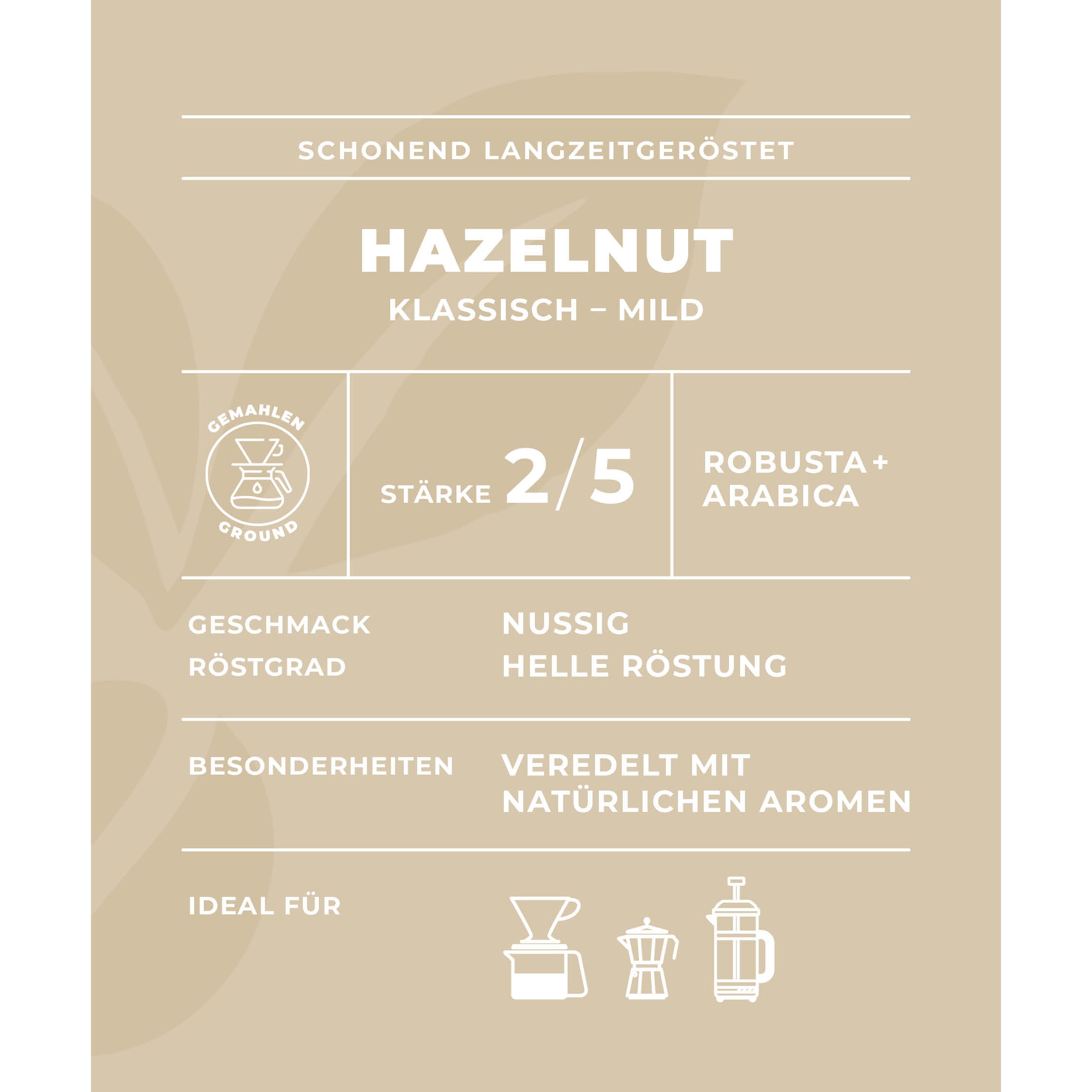 Exquisite Arabica and Robusta coffees serve as the classic base for our flavored coffee specialties. Only natural flavors contribute to the refinement, imparting a pleasant hazelnut note. A delightful change for any coffee lover who enjoys exploring new horizons!