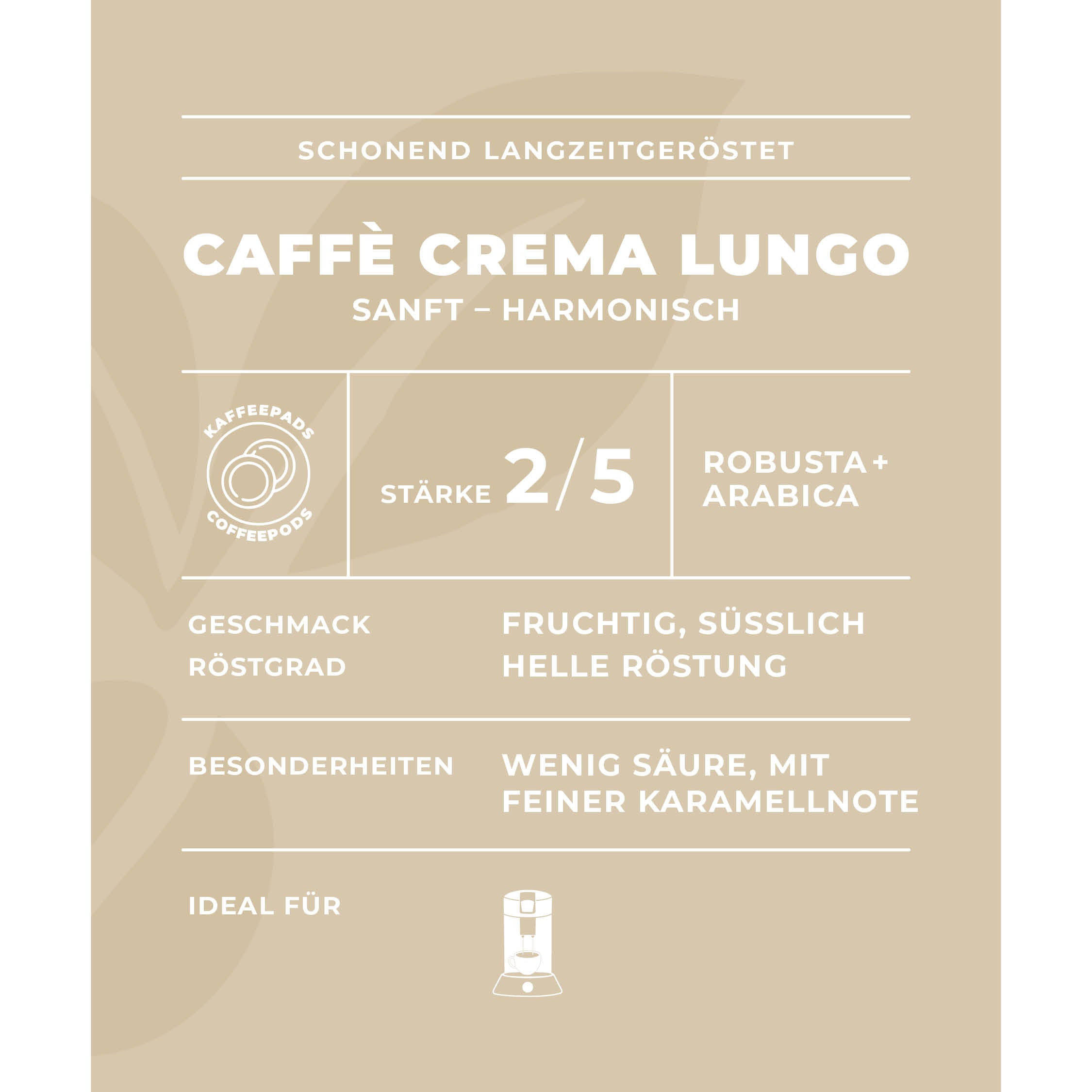 Ein Gourmet-Kaffee für Liebhaber des milden Kaffeegenusses – eine besondere Empfehlung für die klassische, lange Tasse Caffè Crema. Ein harmonischer sanft-milder Körper mit leicht fruchtiger Note.