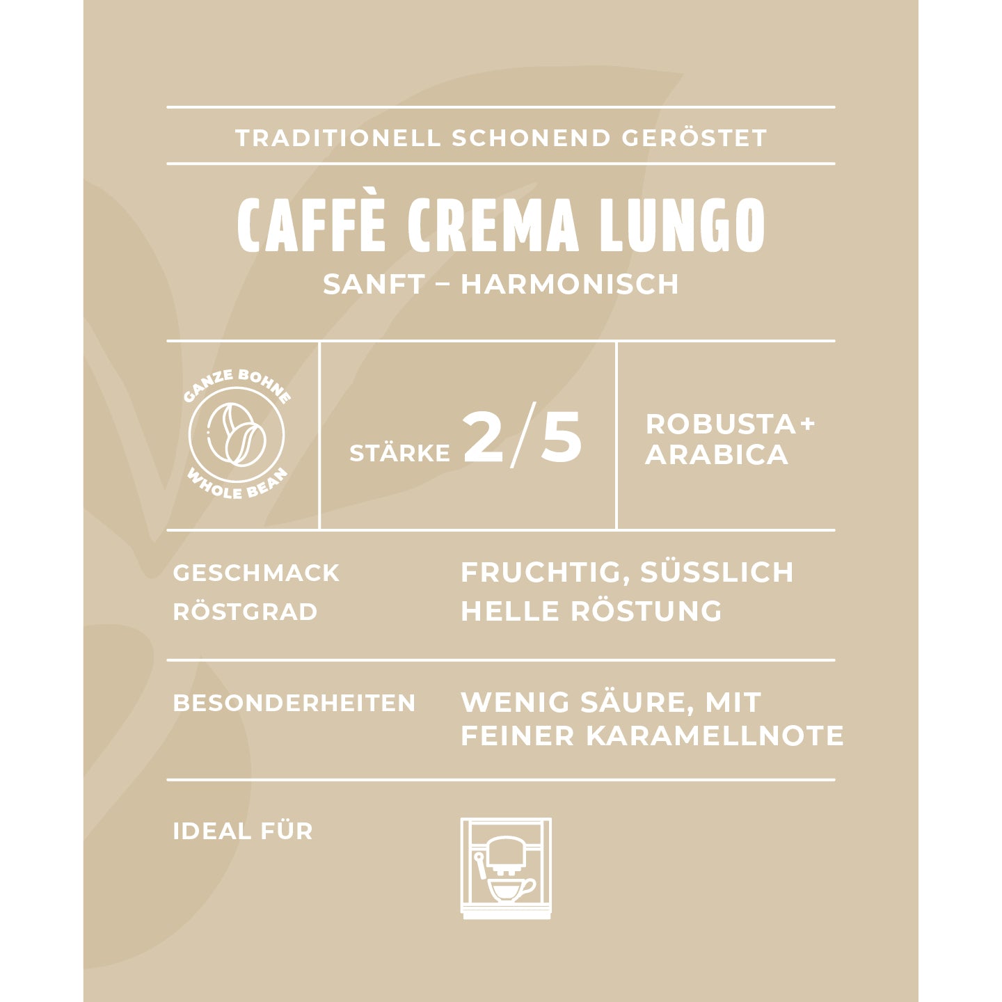 Ein Gourmet-Kaffee für Liebhaber des milden Kaffeegenusses – eine besondere Empfehlung für die klassische, lange Tasse Caffè Crema. Ein harmonischer sanft-milder Körper mit leicht fruchtiger Note.